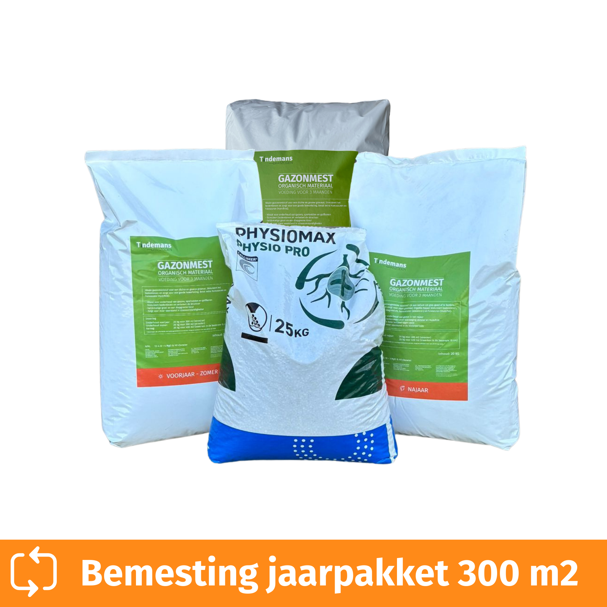Het bemesting jaarpakket (300 m2) bestaat uit twee voorjaarsbemesting, één najaarsbemesting en één kalkkorrel.